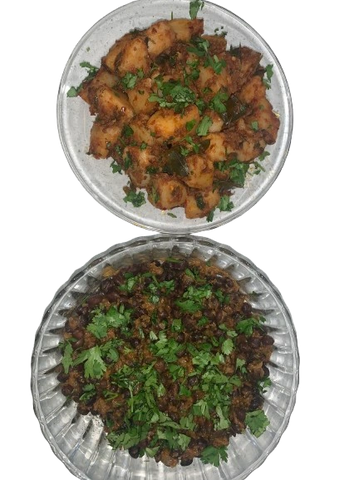 Plates of perfectly seasoned black chickpeas and red potatoes, named after their color.