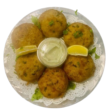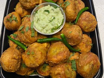 Seasoned potatoes rolled, battered, and fried in a gram-flour batter. Served with coconut-mint chutney.